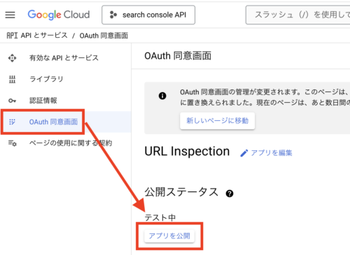 と表示される場合は、「OAuth同意画面」→ 「アプリを公開」から、アプリを公開してください。