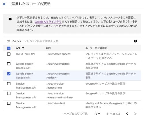 一覧の中から、Google Search Console APIの「...auth/webmasters.readonly」を探してチェックを入れます。