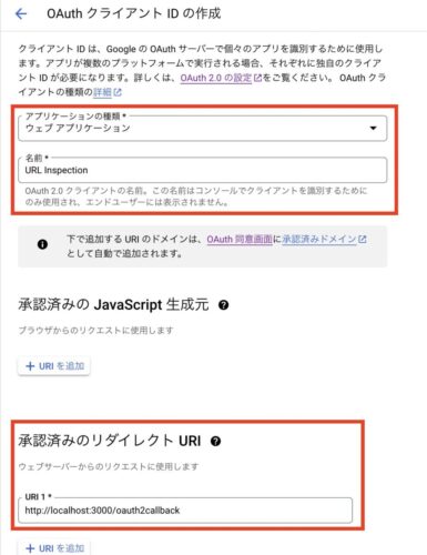 「アプリケーションの種類」にて「ウェブ アプリケーション」を選択し、名前を入力します。