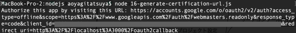 適当な名前(今回の例では16-generate-certification-url.jsとしています)をつけた以下のnode.jsファイルを作成し、以下のコードにクライアントID、クライアントシークレットを入力します。