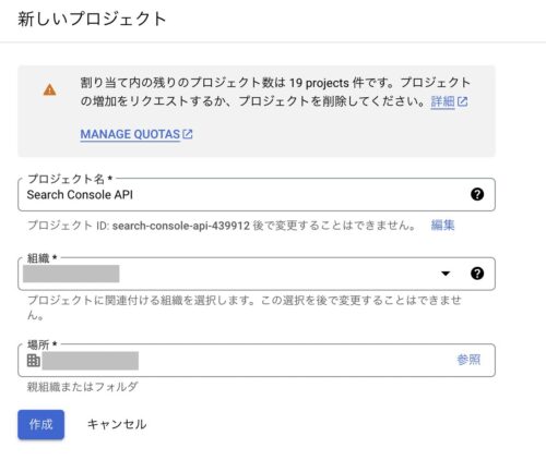 プロジェクト名(Search Console APIなど)を入力して、「作成」をクリックします。