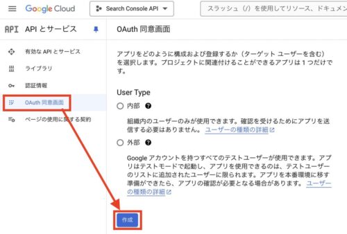 「APIとサービス」→「OAuth同意画面」に移動し、作成をクリックします。
