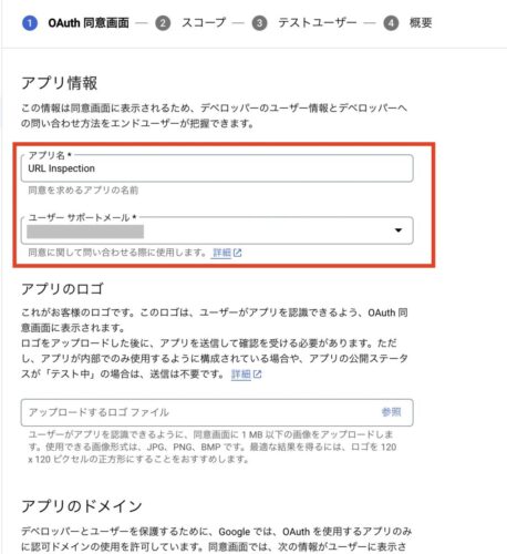 アプリ名は「URL Inspection」などわかりやすい名前を入力します。