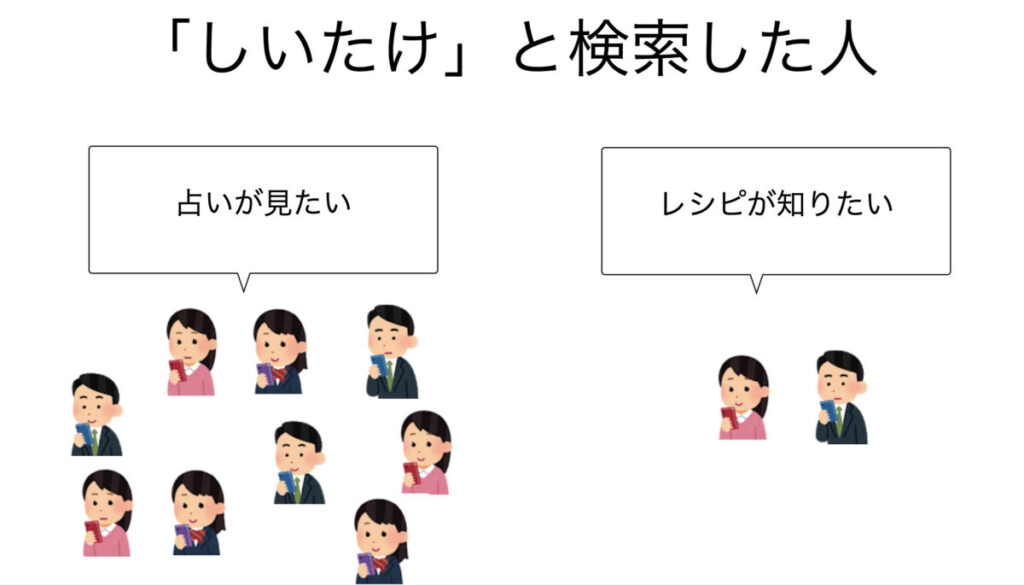 結果として、「しいたけ」というキーワードに対して「占いのサイト」の方が評価が高まり、常に1位に表示されるようになっていきます。