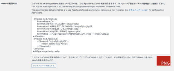 Webpの配信方法にて、「リライトルールを挿入する」をクリックします。