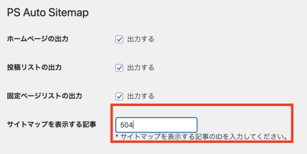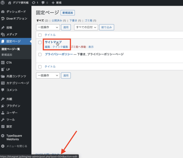 固定ページの一覧にて、サイトマップページのIDを取得します。