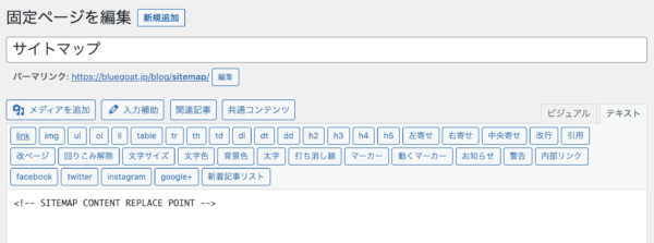 固定ページの編集画面にて、テキストモードで以下のコードを入力します。