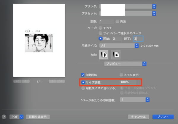正しくハガキサイズにするため、サイズ調整にて、サイズを100%に設定してプリントします。