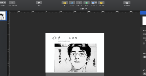 ハガキ自体をコピー機でスキャンして、取り込んだハガキの画像をkeynoteに貼り付けます。