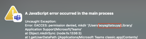 Error: EACCES: permission denied, mkdir '/Users/aoyagitatsuya/Library/Application Support/Microsoft/Teams'