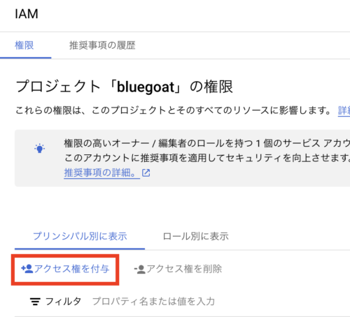 プロジェクトのダッシュボードから、「IAMと管理」→「IAM」を選択します。