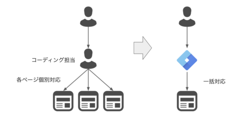しかし、タグマネージャーが最初に導入されていれば、タグマネージャーの設定を変更するだけで自動的にサイトの方にも変更が反映されます。