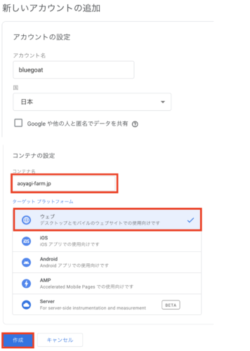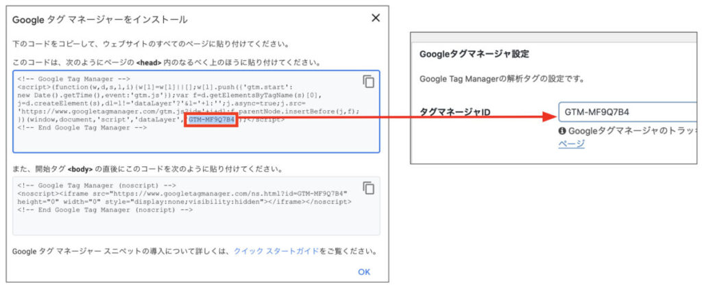 タグマネージャーのスニペットの中に登場する「GTM-XXXXXXX」の部分をコピーし、タグマネージャーIDに貼り付けます。