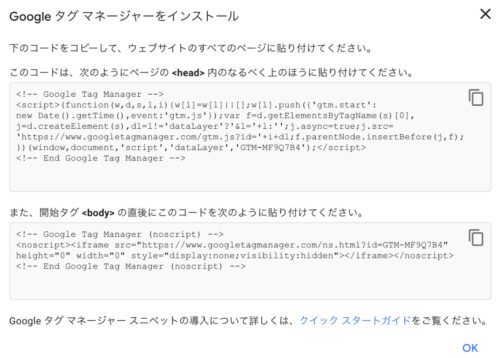 Googleタグマネージャーのトラッキングコードが表示されるので、このページを開いたままにしておきます。