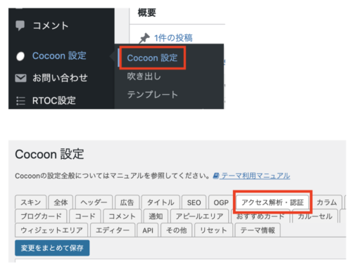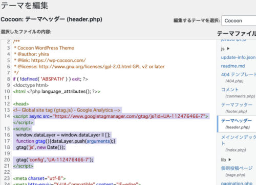 この見出しでは、使用ユーザーの多いワードプレスのテンプレート「Cocoon」の場合を例に、トラッキングコードの埋め込み方を解説します。