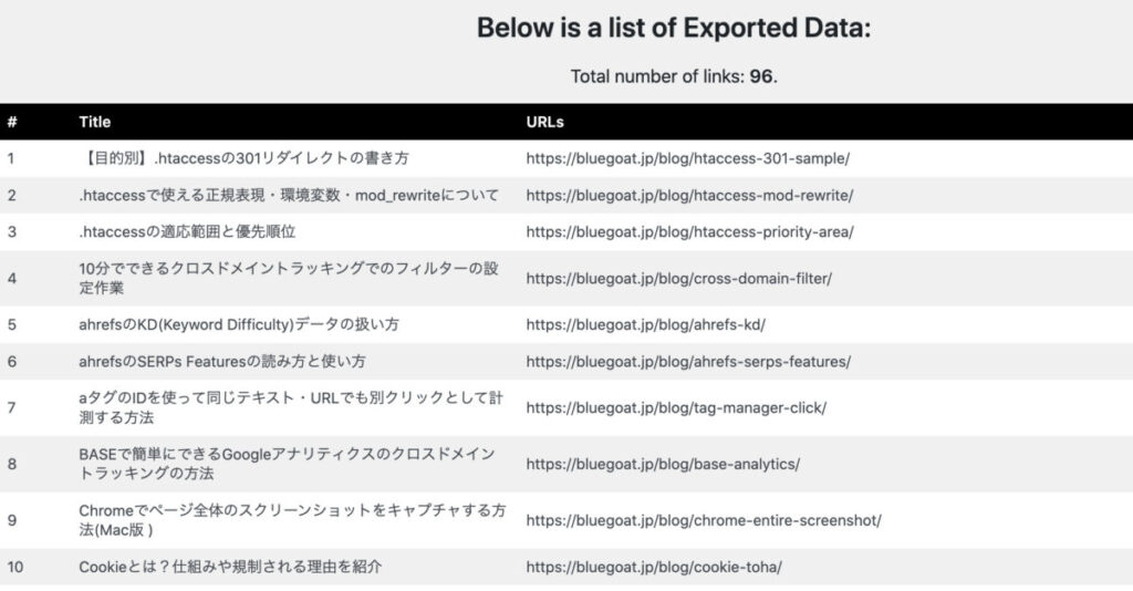 最後に「エクスポート」ボタンをクリックすると、URLがCSV形式でエクスポートされます。