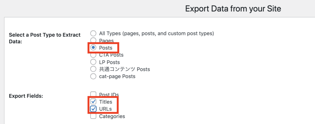 まず、WordPressサイトの管理画面にログインし、「設定」>「すべてのURLをエクスポート」を選択します。次の画面で、以下のオプションを選択します。