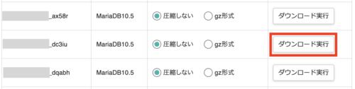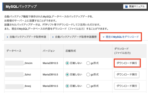 先ほどメモしておいたデータベースを選んで「ダウンロード実行」をクリックします。