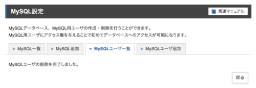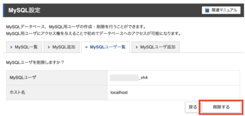先ほどメモしておいた、MySQLユーザー名の削除ボタンをクリックします。