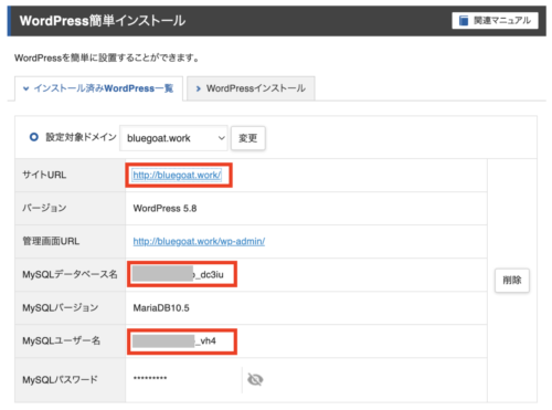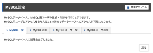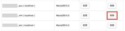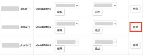 先ほどメモした、MySQLデータベース名を見つけて、一番右にある「削除」ボタンをクリックします。