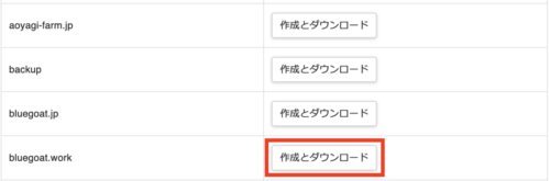 バックアップしたいサイトを選んで、「作成とダウンロード」をクリックします。