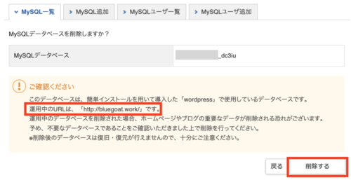 データベース名を再度確認して、「削除」をクリックします。