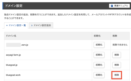 該当のドメインの「削除」ボタンをクリックします。